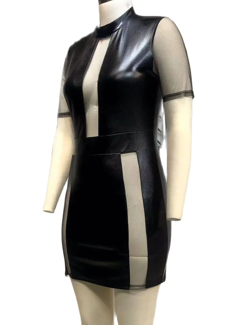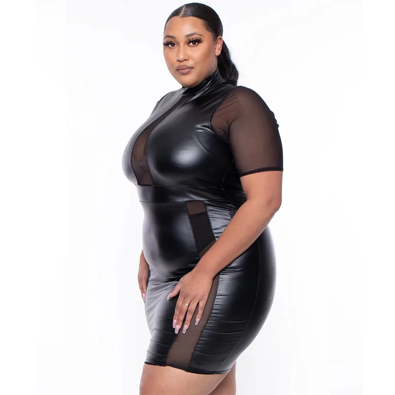 Plus Size Sheer Leather Mini Dress Female Patchwork Mesh Outfit 2023 Women Fashion Elegant Clothing Large Size One Piece Dress